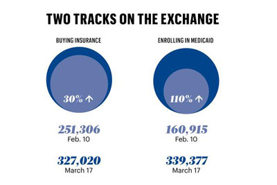 This would bring the totals to 314,936 QHP / 351,461 Medicaid. I should stress, however, that the dramatic ratio shift towards Medicaid that has happened over the past 2 months in NY may actually reverse itself in the final weeks, as QHP-procrastinators finally start scrambling to enroll. If so, that could mean that I have this ratio split off dramatically; I should know later today or early tomorrow and will adjust accordingly. I can't use the new NY data in my March projection until I have the specific number, however; in a state as large as NY, even a small error could make for a significant change in the overall projection, so I'll just have to wait a bit...