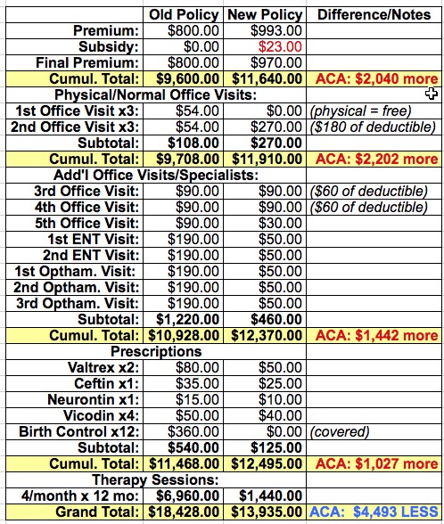 Blammo. With that final addition, the tables have completely turned; the new ACA-compliant policy now saves us almost $4,500 for the year (or $5,500 if you assume that the old plan would have gone up about 10% without the ACA).