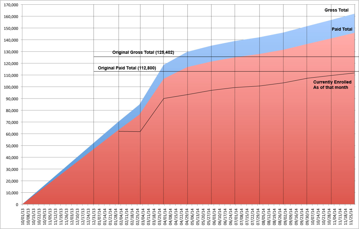However, they also include their gross, paid and current (as of that time) projections through the end of 2014 (which presumably runs through 11/15, since anyone who enrolls after that doesn't start their coverage until January 2015 anyway, part of the 2nd open enrollment period).