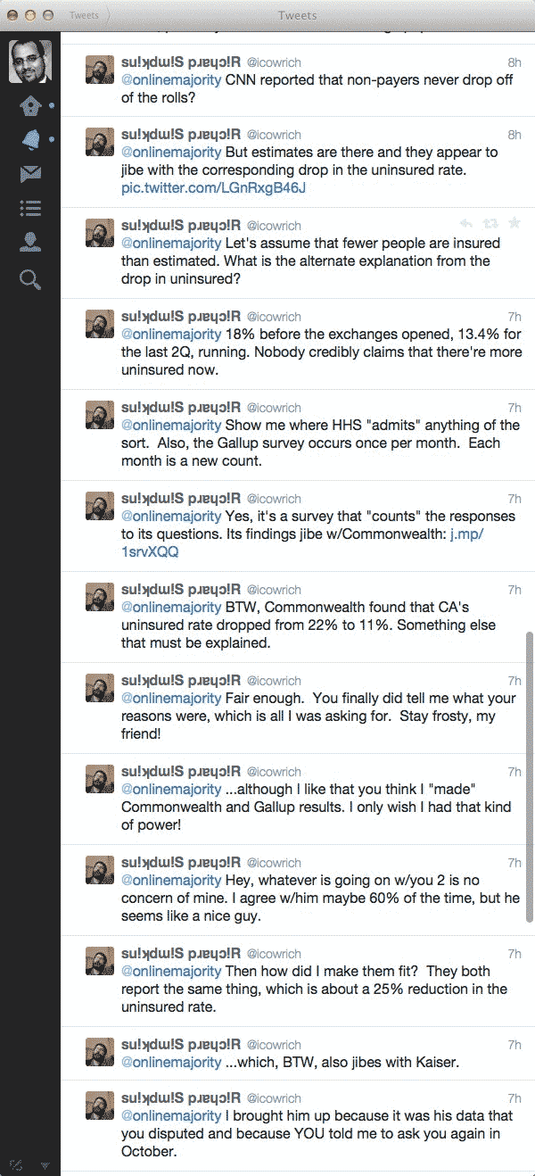 Last night, @icowrich (the other guy referred to in Michael's original tweet above, and a regular commenter here at ACA Signups), who didn't forget, decided to follow up with him regarding his "no way CA hit a million paid" claim from March.