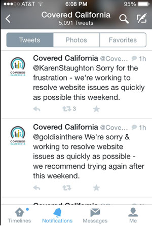 California: I heard anecdotal evidence that CoveredCA was having some significant issues on opening day, but it wasn't until I checked their Twitter feed and saw a series of posts like this that I grew concerned: