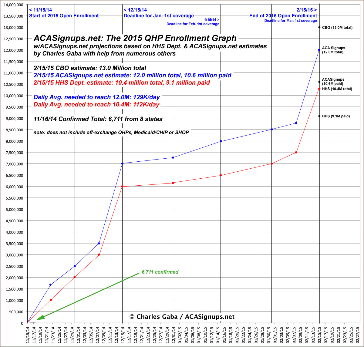 Finally, like last spring, there should be a similar lull followed by a second huge spike as people scramble to get covered before the February 15th deadline, for coverage starting March 1st. If I'm right about another 4 million or so during this period, that would hit my total estimate of roughly 12 million exchange-based QHP enrollees by 2/15/15.