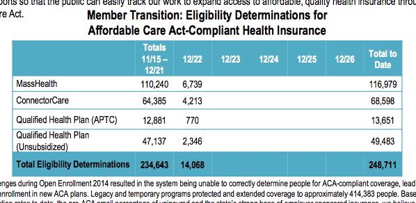 Today is the final day for Massachusetts residents to enroll in a private healthcare plan if they want coverage to start on January 1st. As of last night, they had a total of 248,711 eligibility determinations, of which 131,732 are for private QHP policies (the other 117K have already been enrolled in Medicaid, aka "MassHealth", which is impressive in and of itself).