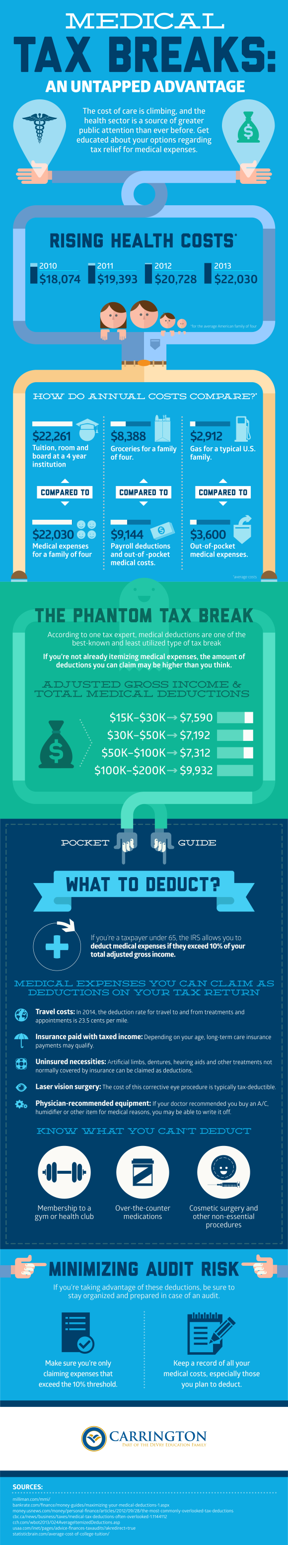 The infographic lays out how much money can be saved by taking advantage of medical tax deductions: The annual health care cost for a family of four is $22,030, which translates into an average year of college tuition, including room and board. A substantial portion of this figure can be redeemed through medical deductions – one of the most overlooked tax breaks. If adjusted gross income is between $15K and $100k, for example, it is possible to write off a little over $7k as a medical deduction.