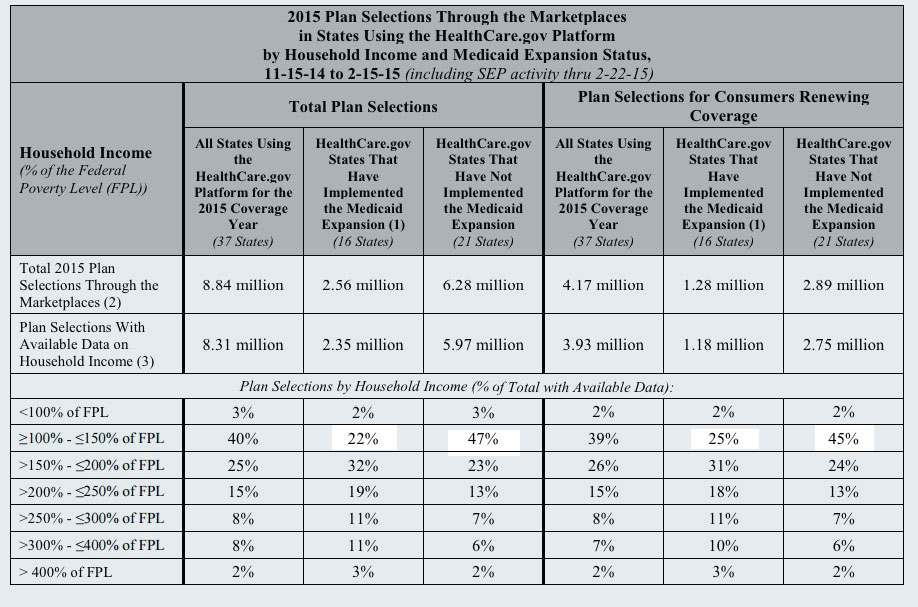 - As Andrew Sprung noted, check out the discrepancy between the income levels of those who enrolled in private policies via HC.gov in Medicaid expansion states vs. NON-expansion states: