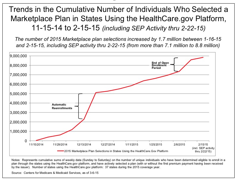 - More than 8.84 million people selected or were automatically reenrolled in 2015 plans through the Marketplaces in the 37 states that are using the HealthCare.gov platform. This includes: