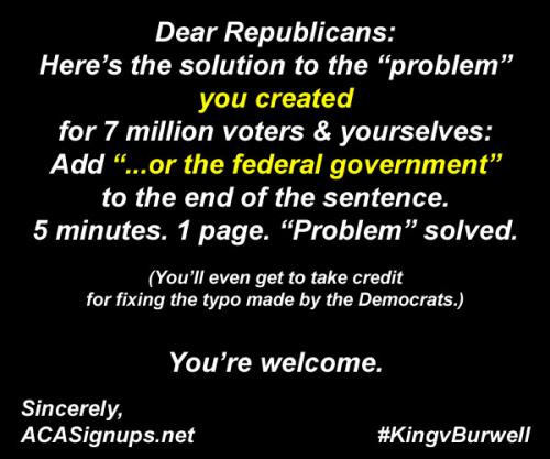 Actions have consequences. Yes, the Democratic Party probably made a minor drafting error when they passed the ACA. However, that error could have been resolved in 5 minutes if the Republicans in Congress hadn't been so obsessed with tearing down anything enacted by Barack Obama (even a law which is pretty much your party's creation). The job of publicly elected officials, in case all of you have forgotten, is supposed to be to make life better for people, which includes not being a royal jackass at the expense of millions of people's well-being.