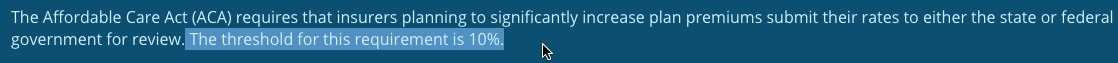 HOWEVER, at the same time, there are several major gaps in this tool. Some of them, such as not breaking out the rate requests by metal levels, are merely unfortunate. One, however, is extremely important, and from a media perspective could make this tool worse than not having it at all: It only includes companies which are asking for increases of more than 10%.