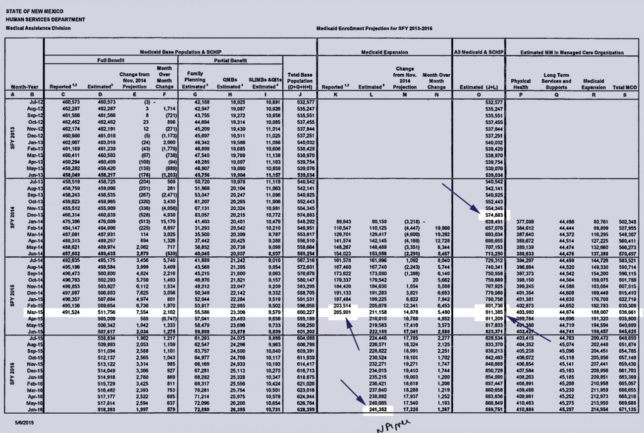 As you can see from the NM Medicaid enrollment report below (click on it to see the full-size version), as of the end of March, New Mexico was up to 205,901 people enrolled specifically in the ACA expansion program. According to the NM Human Services Dept., the state was only expecting around 170,000 people total to even be eligible.