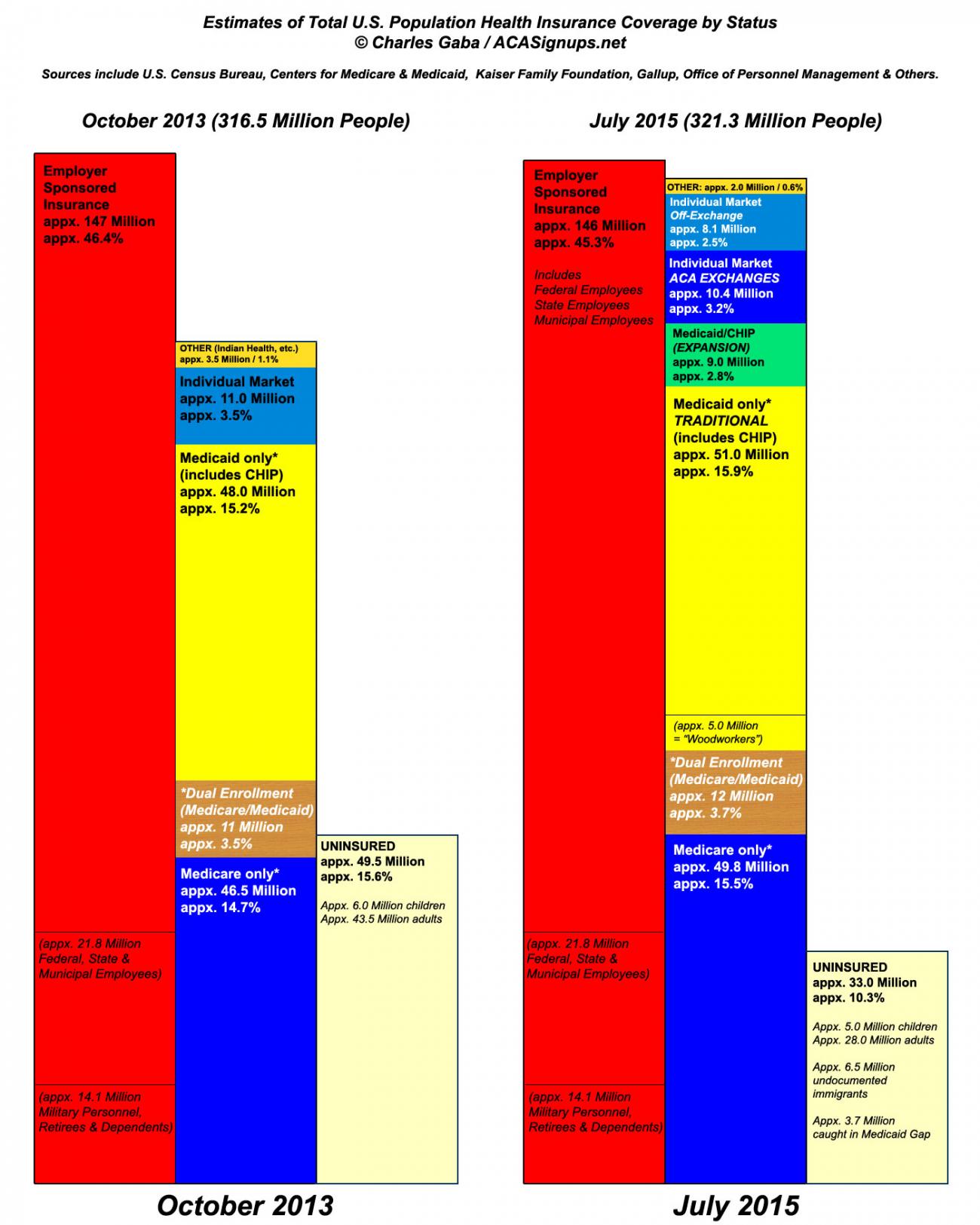 With all of that out of the way, here's my best crack at trying to portray the current healthcare coverage status of every single person in the United States of America as of October 2013 (just prior to the launch of the ACA exchanges and Medicaid expansion program) and July 2015. Comments welcome. I've added some additional notes below the graphic.