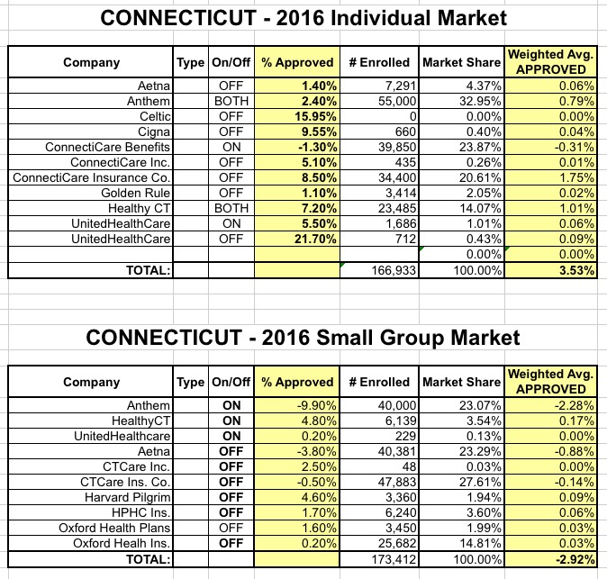 Connecticut: *Approved* 2016 weighted avg. rate hikes: +3.5%, -2.9% sm. group