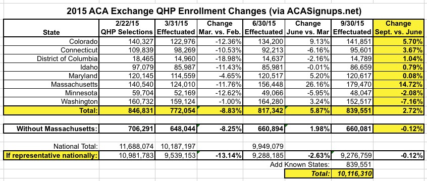 UPDATE 10/22: Washington State has released their September effectuation number; it's the first state with a significant drop (7.1%), which lowers the likely national increase to just 2.7% if you include Massachusetts, or a very slight (0.1%) drop without MA: