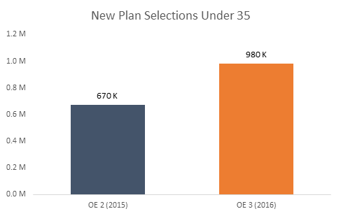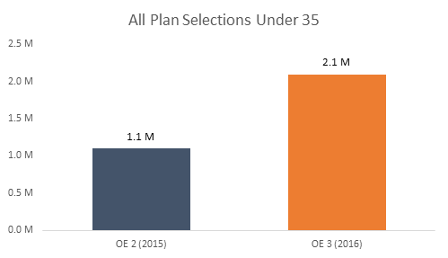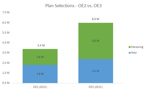 Nearly 6 Million Plan Selections Nov 1 – Dec 17. Through the deadline for January 1, 2016 coverage, almost 6 million people signed up for health coverage through HealthCare.gov, compared to last year when about 3.4 million had signed up by the first enrollment deadline. Of the nearly 6 million total consumers already enrolled for 2016 coverage, 2.4 million are new consumers, compared to 1.8 million new consumers in the same period for OE2.  Note: None of the OE2 and OE3 figures reported in this document include individuals auto-enrolled for January 1 coverage.  Nor do they include plan selections in the 13 State-based Marketplaces that use their own technology platform.