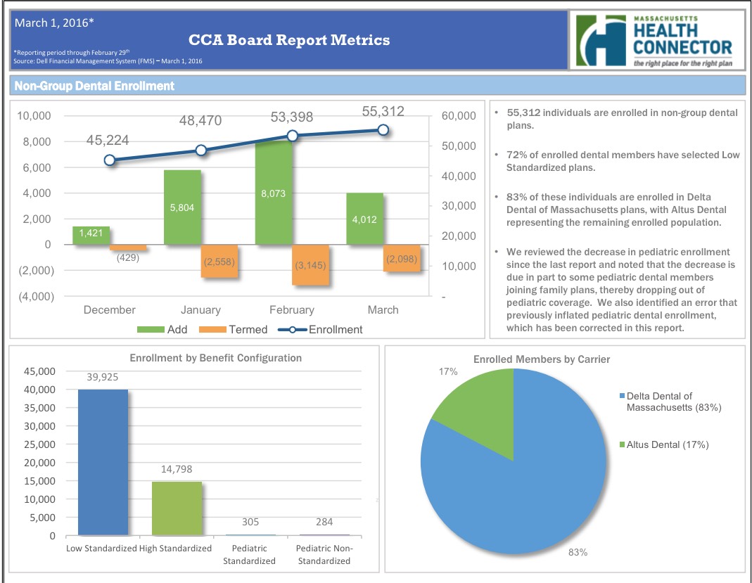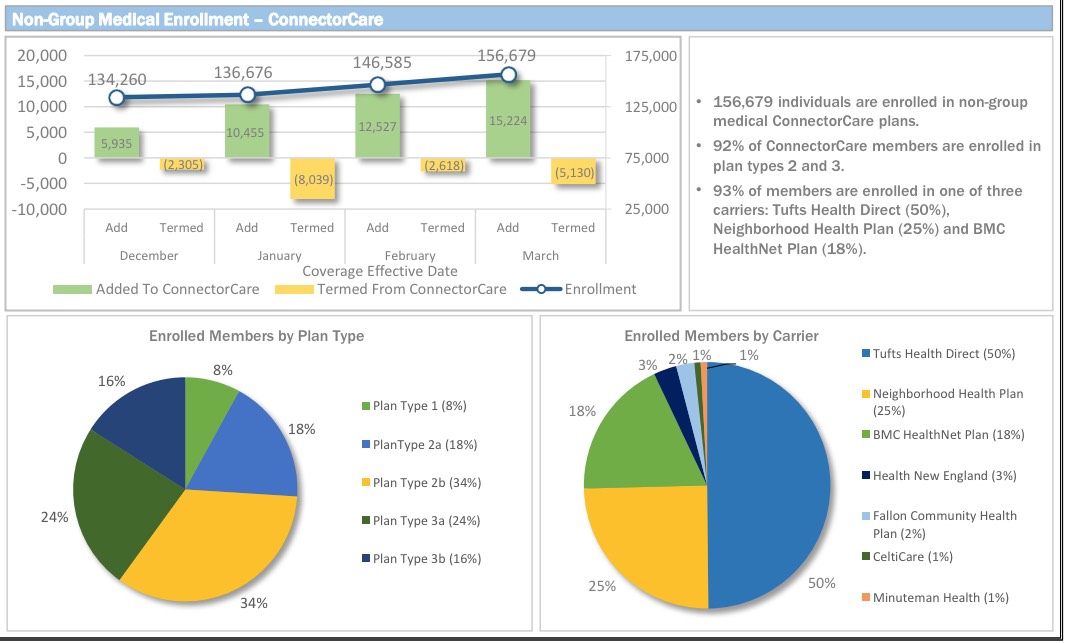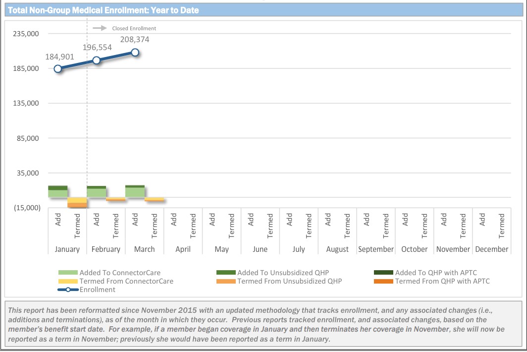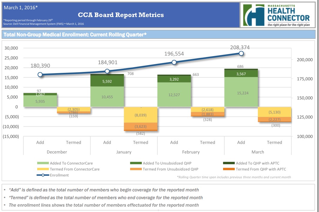 They just held their March board meeting, which always include highly detailed powerpoint charts & graphs running through the end of the prior month...so here's where things stand after the first month of the off season. The main number: The official effectuated enrollment number is up to 208,374 (remember, Massachusetts doesn't even report QHP enrollees until they've actually paid their premium. It'd be awesome if every other exchange was able to do so as well, as that would finally kill off the "But how many have PAID??" talking point once and for all.