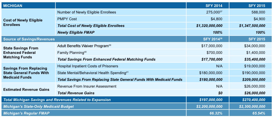 Add those up and that's $235 million in hard dollars either saved or earned in Michigan. MI spends around $3,100 per adult on "traditional" Medicaid; while this might vary for expansion enrollees, it seems like a good base. 100% of this is covered by federal taxes through the end of this year, meaning that by the time Michigan has to start chipping in our 5-10% of the total, we'll likely have racked up perhaps $600 million in savings/extra revenue for the first three years...and remember, those savings/revenue will continue to some degree even after the state has to start ponying up.
