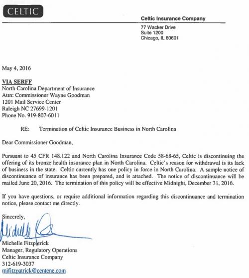 - In North Carolina, Celtic Insurance is also pulling out of the individual market...but from what I can tell, they barely had anyone enrolled there anyway (they only had 1 bronze plan available, and it doesn't look like they have more than a handful of people using it):