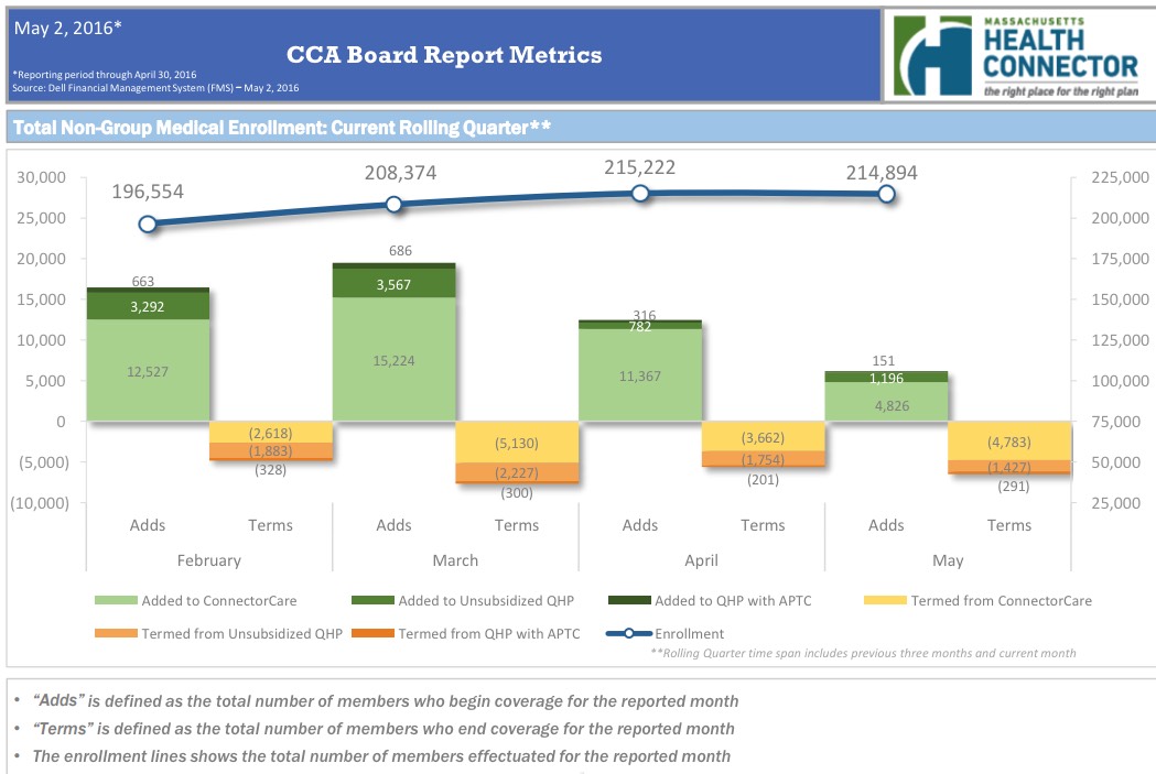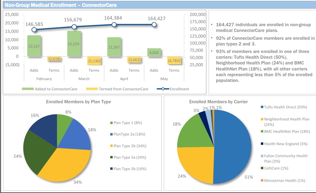As I've noted the past few months, unlike most states, the Massachusetts Health Connector has not only seen no net attrition since the end of Open Enrollment, but has actually seen a net increase in enrollment...mainly due to their unique "ConnectorCare" policies, which are fullly Qualified Health Plans (QHPs) but have additional financial assistance for those who qualify and which are available year-round instead of being limited to the open enrollment period.