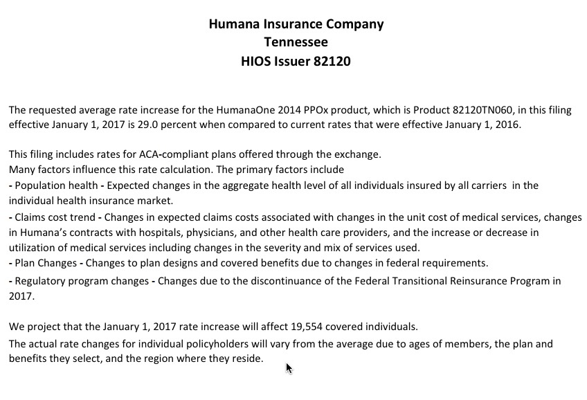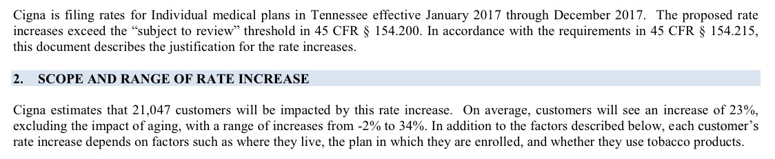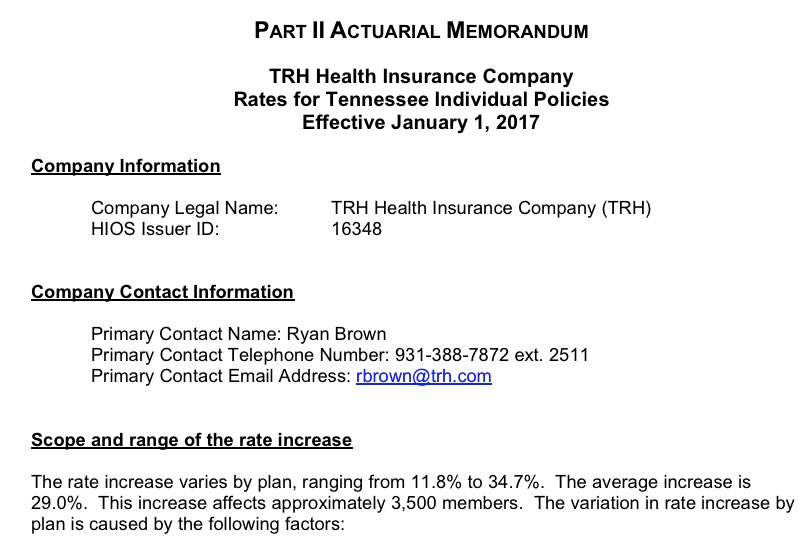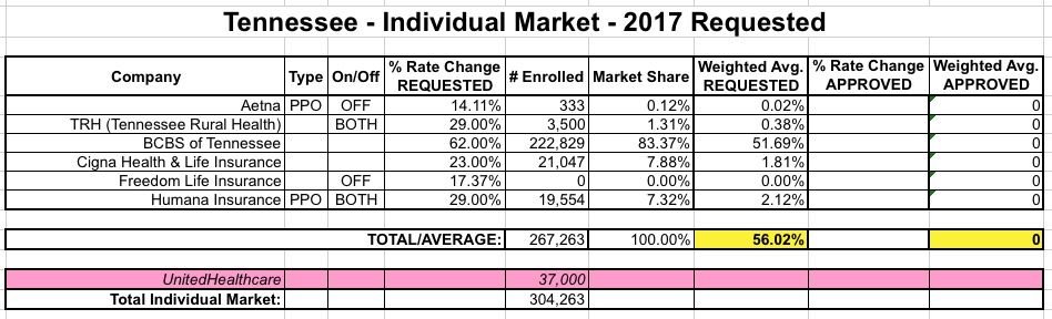 Put 'em together and...ugh. 56%. Assuming the rate requests are approved at levels close to what has been requested, unsubsidized Tennessee residents are looking at pretty ugly rate hikes next year. As always, we'll see how the regulators respond.
