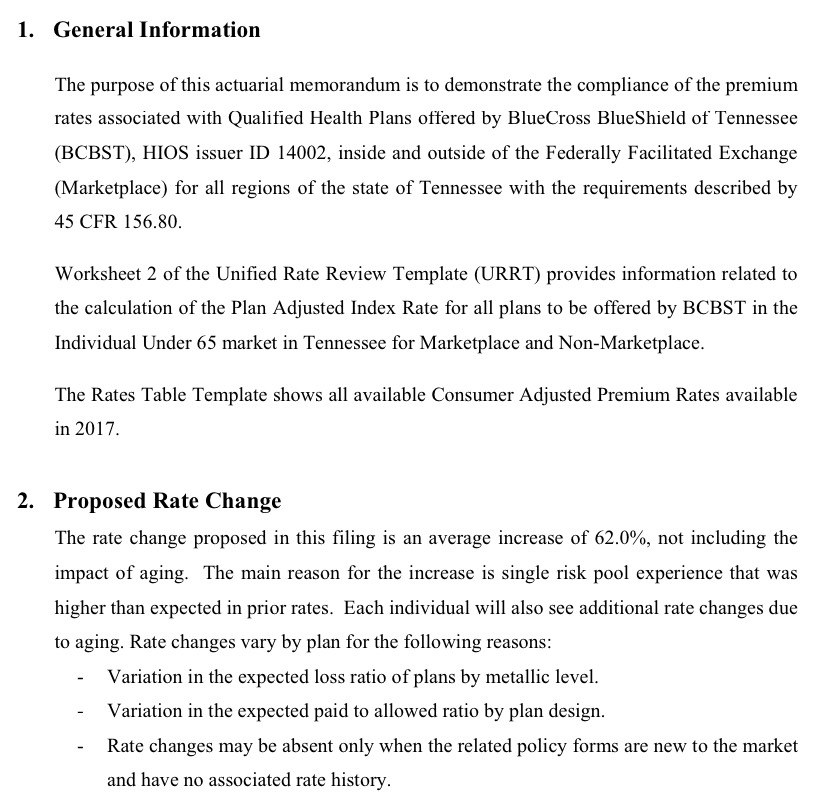 Most of the other carrier data is taken straight from their 2017 filings. The major exception is the big one: BCBSTN, which holds a commanding 68.91% of Tennessee's exchange-based enrollment, is asking for a whopping 62% average rate hike next year (ouch). Unfortunately, their filing (see below) doesn't list the number of covered lives who'd be impacted by this increase, but another part of the filing does state that they're assuming that roughly 67% of impacted members will be exchange-based. Using the same estimates as above, that means BCBS has about 161,000 exchange-based enrollees...and if that's 2/3 of their total, that means around 241,000 total.