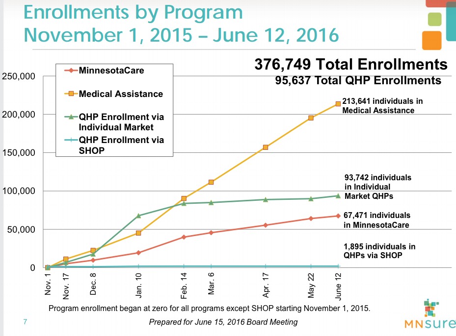 • 5/23/16 - 6/12/16: 95,637 (+3,769, or 179/day); 67,471 MNcare (actually, 112,583 total); 213,641 Medicaid