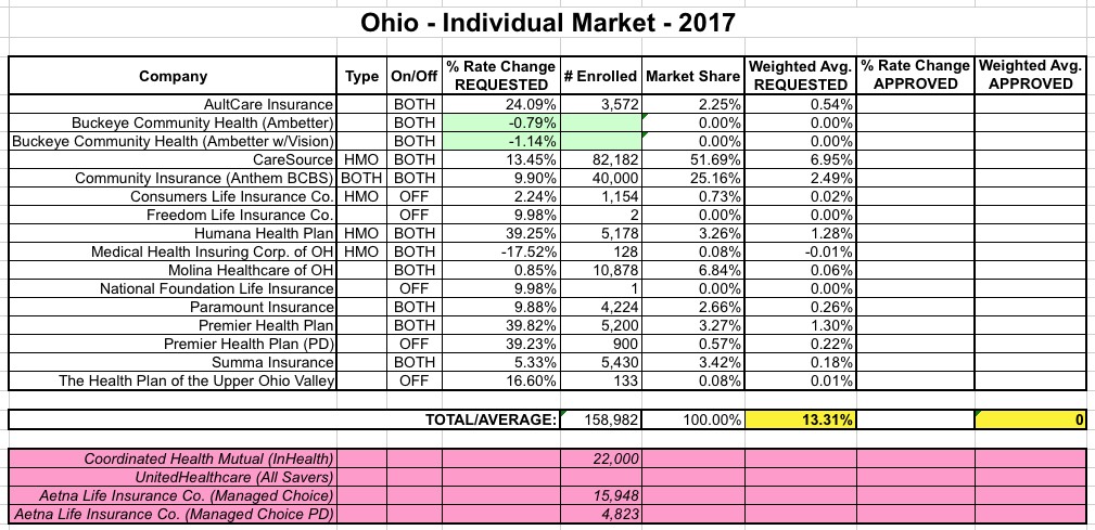 With all that in mind, here's a whole mess of revised/updated requested rate change tables for various states. The updated numbers will be plugged into the 50-state spreadsheet, with higher averages colored in pink while lower averages are colored light green.