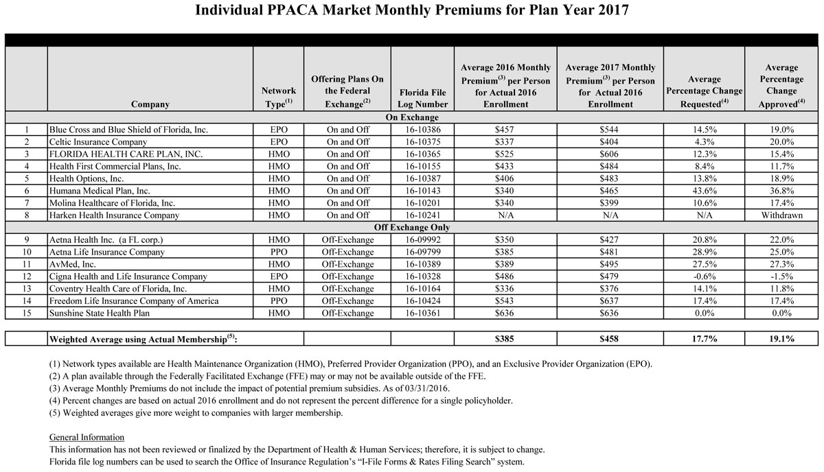 TALLAHASSEE, Fla. – The Florida Office of Insurance Regulation announced today that premiums for Florida individual major medical plans in compliance with the federal Patient Protection & Affordable Care Act (PPACA) will increase an average of 19% beginning January 1, 2017. Per federal guidelines, a total of 15 health insurance companies submitted rate filings for the Office’s review in May. These rate filings consisted of individual major medical plans to be sold both on and off the Exchange. Following the Office’s rate filing review, the average approved rate changes on the Exchange range from a low of -6% to a high of 65%. This information can be located in the attached “Individual PPACA Market Monthly Premiums for Plan Year 2017*” document.