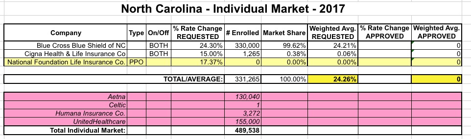 Aetna had proposed an average rate increase of 24.5 percent, but that is no longer applicable for exchange enrollees, as Aetna’s plans will not be available in the North Carolina exchange in 2017.