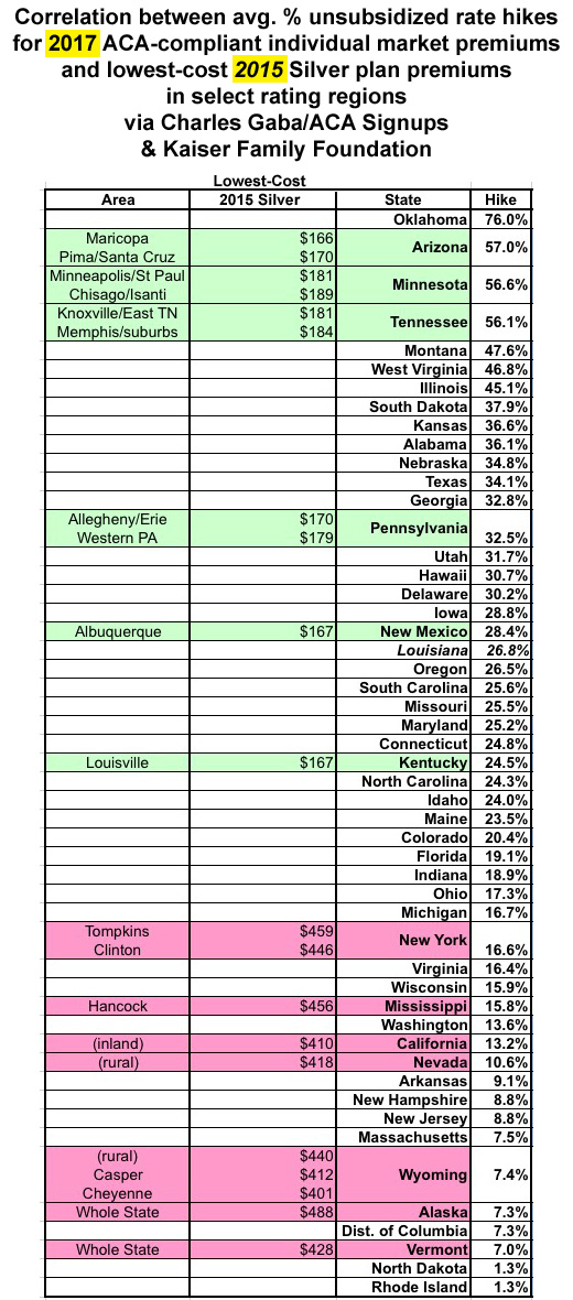 As you can see, they kind of do so...but not really. West Virginia has among the highest premiums in the country this year but is still looking at a 47% average hike next year...and Nevada, which has a fairly low average premium this year is only looking at a 10.6% average hike in 2017.