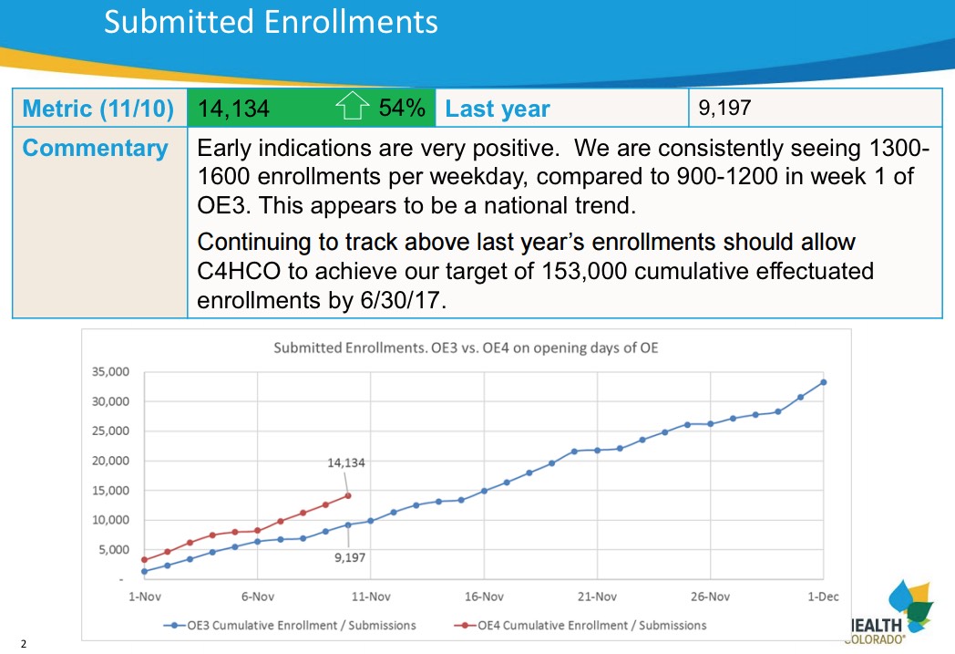 The pace of sign ups is running 30 percent higher than last year, Patterson said, with 1,300 to 1,600 plan selections submitted each weekday during the first days of the annual Open Enrollment Period. Enrollees submitted 16,305 plan selections through Sunday. The total was 12,496 for comparable days in 2015. The 2017 plan selections include 2,648 customers who are new to Connect for Health Colorado.