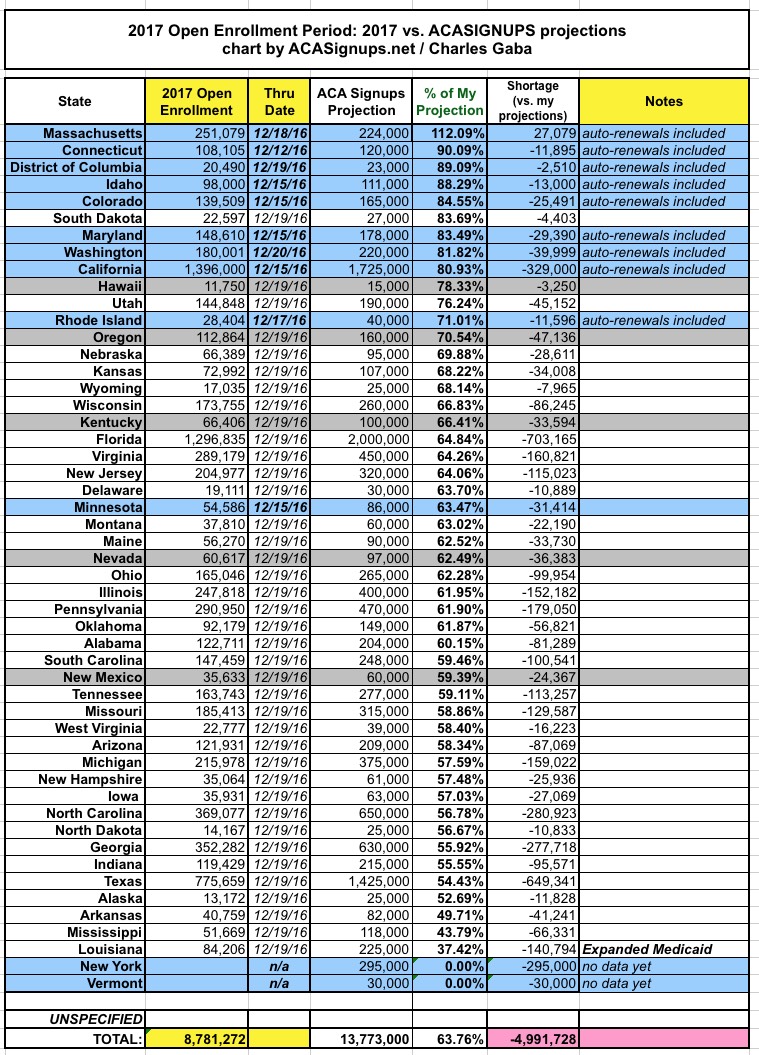 Since auto-renewals have already been added to most of the state-based exchange numbers but not to the federal exchange numbers, it gets a little tricky to visualize. The blue sections show how far ahead 11 states are based on their status. I'd expect any state which has already added in their auto-renewals to have reached around 85% of my final target, while those which haven't added them to the tally should only be at around 65%.