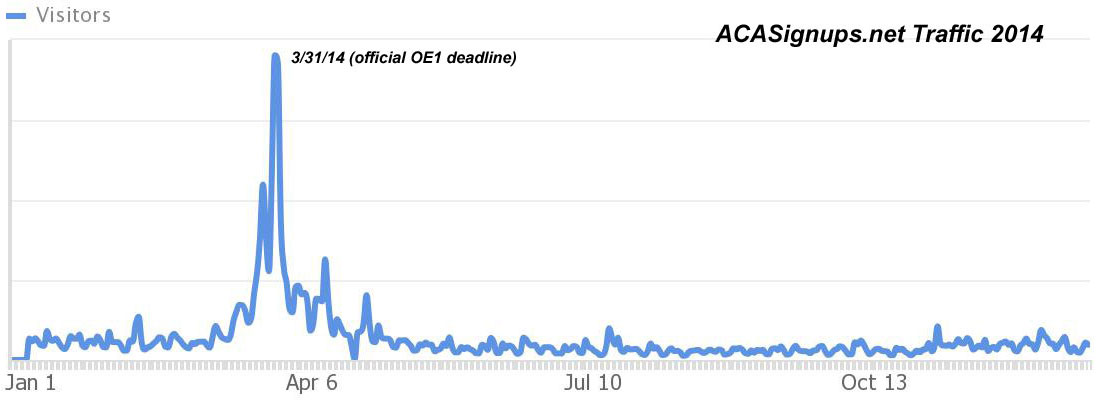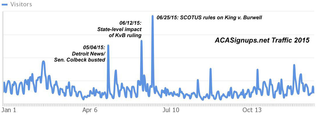 As an aside, here are similar charts for 2014 and 2015. As you can see, there were fewer significant spikes in the prior years, although nothing can compare to the big one on March 31, 2014 (the official deadline of the very first Open Enrollment Period, although they also tacked on a 2-week "overtime" period to handle the overflow traffic). I've yet to surpass that record and likely never will (the day of the Supreme Court's King v. Burwell ruling came close).