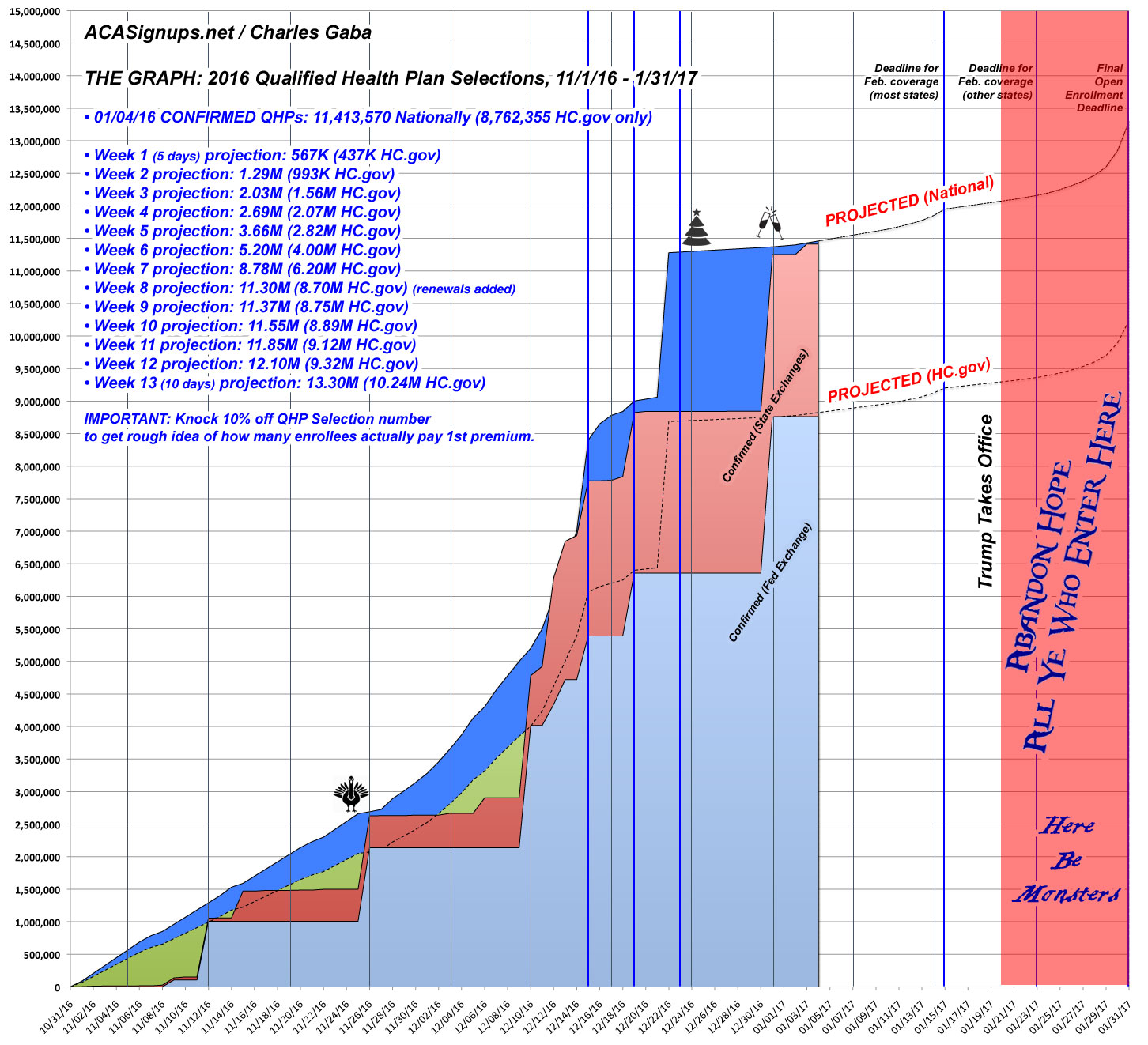 It's pretty clear to me now that, barring a last-minute panic-surge over the final 11 days of the Open Enrollment Period due to the shock of realizing that yes, Donald J. Trump really did become President of the United States starting January 20th, 2017, there's very little chance of achieving the pre-election projection of 13.8 million exchange-based QHP selections made by both the HHS Dept. and myself.
