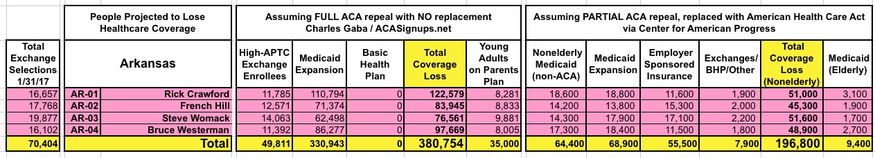 With that in mind, here's state-by-state tables comparing the projected coverage losses in all 435 Congressional Districts under either scenario: Full repeal with no replacement vs. partial repeal/replace via the Trumpcare bill. As you can see, the totals within each CD or state are considerably higher or lower in some cases...but the grand total still somehow ends up being roughly the same nationally.