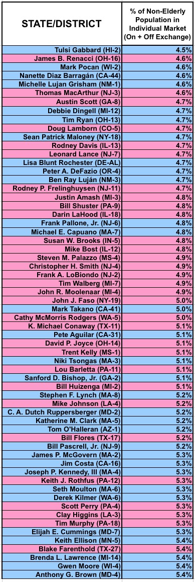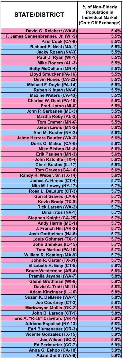 In additon to color-coding their data by the political party of each District's Representative, I'm also adding my own spin on the data: Estimates of how many people currently enrolled in the individual market suffer from "pre-existing conditions" which would likely mean them either being denied coverage altogether if the ACA's Guaranteed Issue, Essential Health Benefits and Community Rating provisions were to be stripped (Alternately, these people would charged massively higher rates to the point of likely not being able to afford the policy).