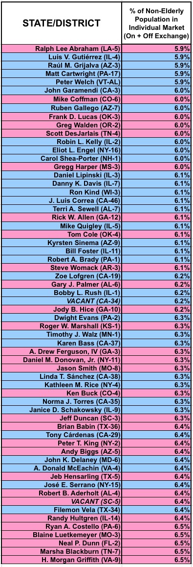 Here's all 435 Congressional Districts, sorted from lowest to highest by what percent of their non-elderly population I estimate is currently enrolled in the individual market (both on and off-exchange combined):