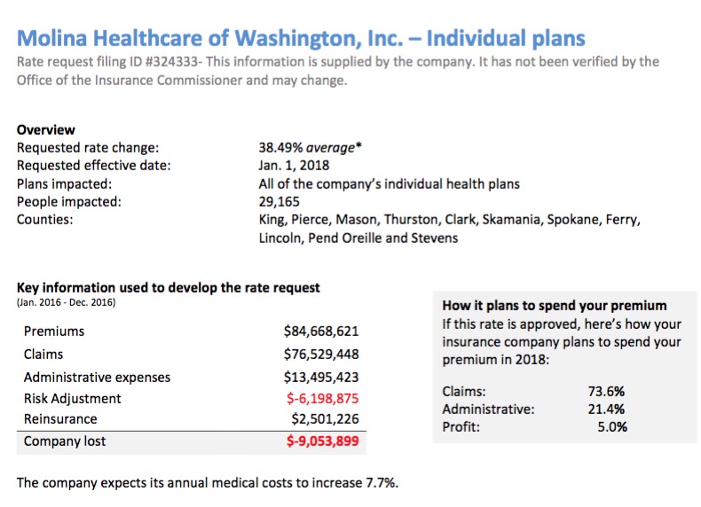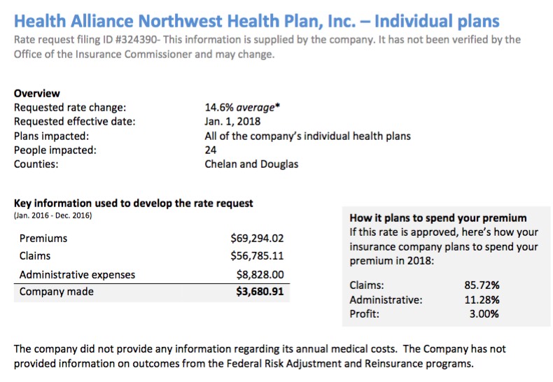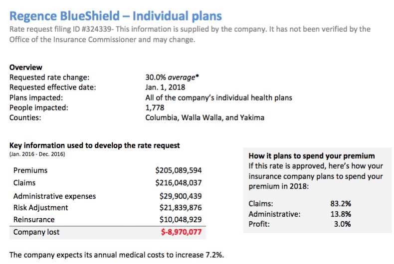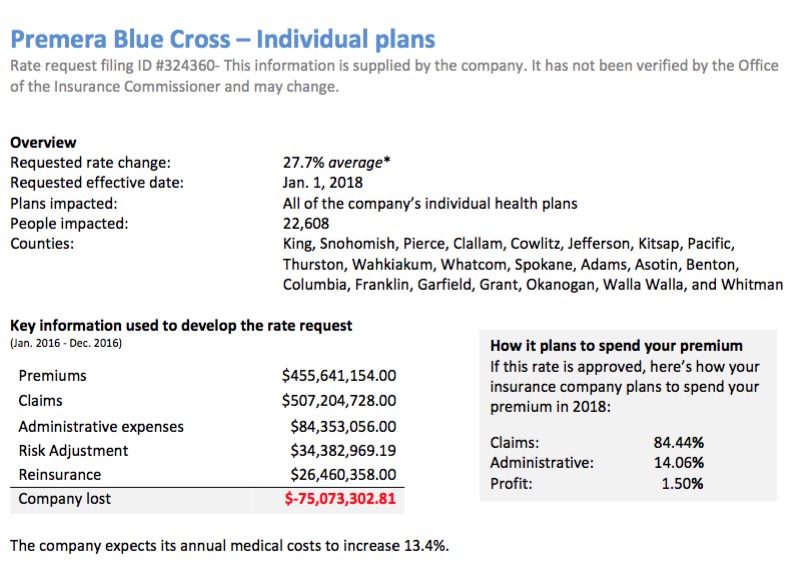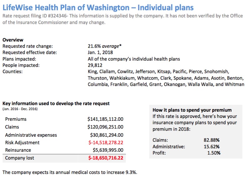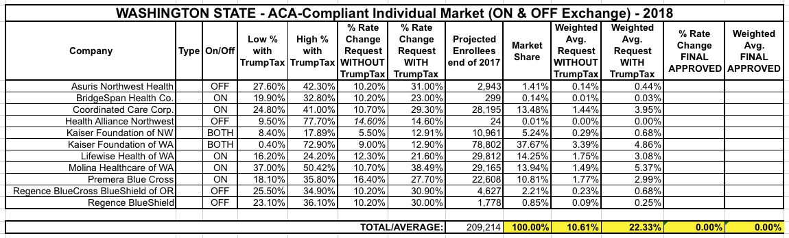 The statewide average is 22.3%...but the WA Insurance Commissioner specifically requested that the carriers break out their actual medical cost increases from the rest of the hike request. You can see this at the bottom left of each rate filing summary; for instance, Asuris Northwest lists their medical cost increase as only being 7.2%. You then have to tack on another 3% to cover the ACA's Carrier Tax (which was given a 2-year "holiday" in 2016 & 2017), which means that without the Trump/GOP Sabotage Effect (Cost Sharing Reduction & Mandate Enforcement uncertainty), Asuris would only be requesting a 10.2% rate hike instead of the 31% they're asking for with CSR/Mandate uncertainty.