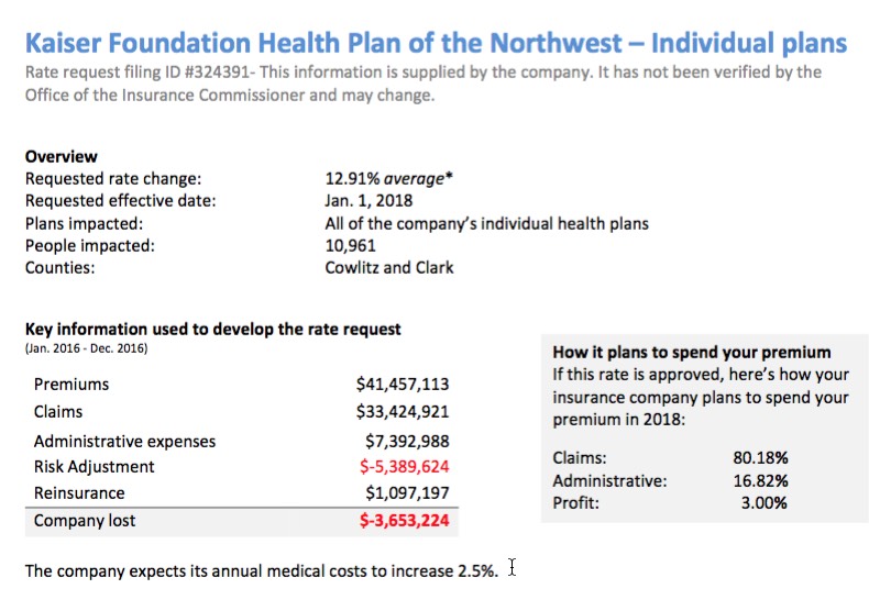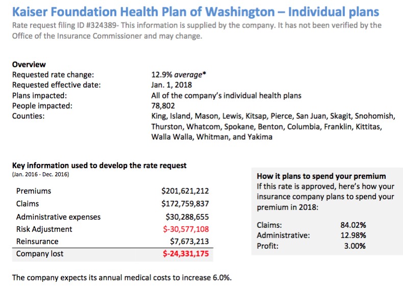 “I’m very concerned by the proposed changes we’re seeing,” Kreidler said. “I know these numbers will be extremely upsetting to people who buy their own health insurance. They’re upsetting to me. We’re going to spend the next several months reviewing every assumption insurers have made to make sure their proposed increases are justified.