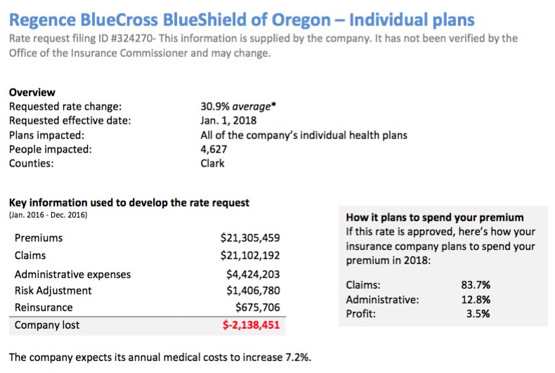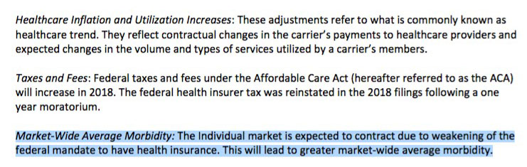 UPDATE: Several commenters have rightly noted that most of the carriers lost money in 2016 ($141 million collectively out of $1.3 billion in total premiums...about 10.8% overall), which means that in order to make a profit they'd have to bump up their prices about 11% beyond their "increased medical costs" regardless. Fair point...except that each of them received rate hikes from 7-25% for 2017 already. I have no idea what their profitability has been/will be for 2017.