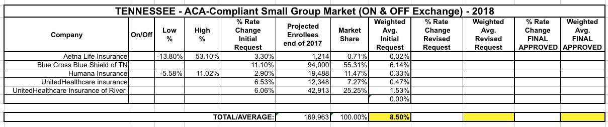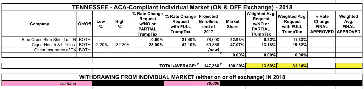 To my knowledge, there are actually 6 individual market carriers in Tennessee this year: Aetna, TRH (Tennessee Rural Health), Blue Cross Blue Shield, Cigna, Humana and "Freedom Life" (which, again, is basically a phantom carrier with no enrollees). Aetna and Humana are out, so that leaves TRH, BCBSTN and Cigna. TRH doesn't appear to have submitted an official 2018 rate filing as of yet, but they only had 3,500 enrollees this time last year anyway, so likely won't have much impact on the overall weighted average rate hikes.