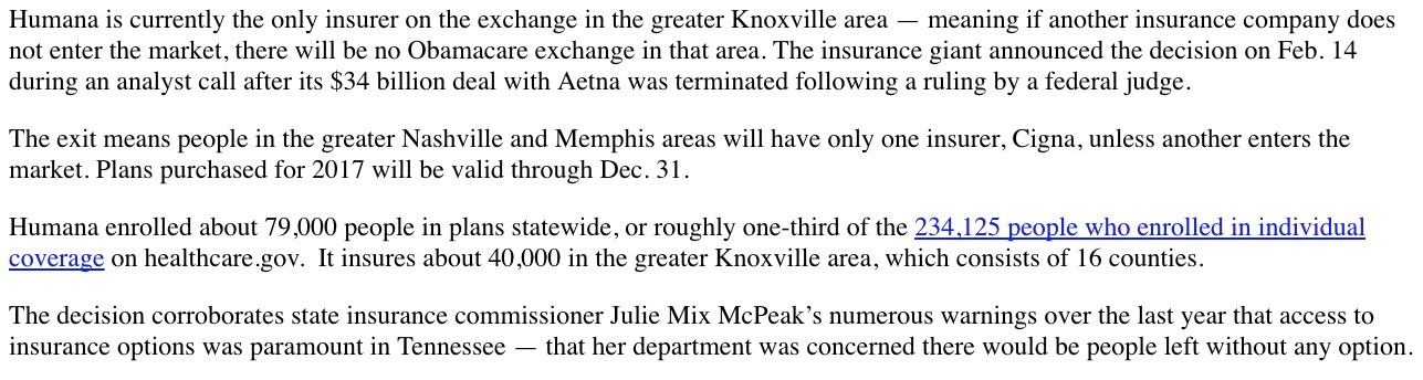 This year, to the best of my estimates, Tennessee's total individual market consists of roughly 300,000 people, around 2/3 of whom are enrolled via the federal ACA exchange. Humana is dropping out of the state next year, meaning roughly 79,000 enrollees will have to shop around.