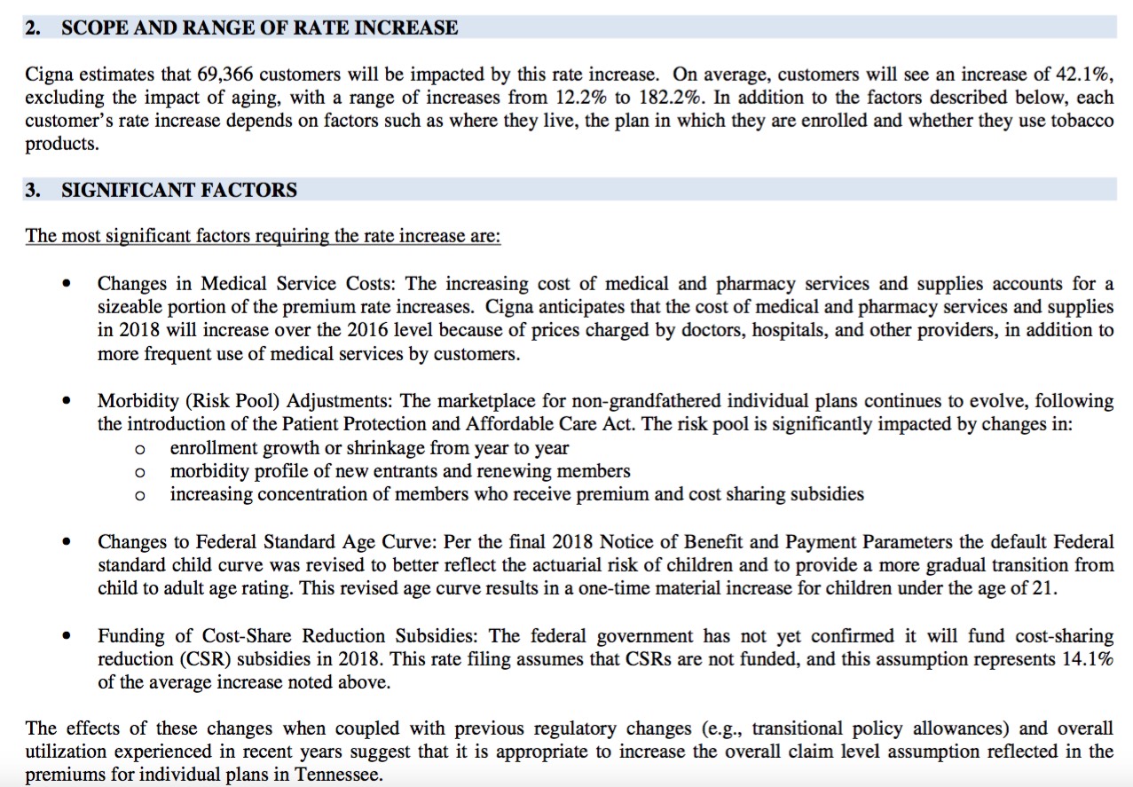 Cigna's filing hike request is a pretty ugly 42.1% overall...but they clearly state that a full 14.1 percentage points of this...or a solid third...is due specifically to Donald Trump and the Congressional GOP's threats to cut off the legally-owed Cost Sharing Reduction reimbursements due to the carriers. They also make a reference to Trump/Tom Price's threats not to enforce the individual mandate (by way of the increased morbidity profile expected for next year), but don't specifically break that part out. Without the CSR sabotage threat, however, they clearly state that they'd "only" be requesting a 28% increase (still ugly, but not as bad as 42%).