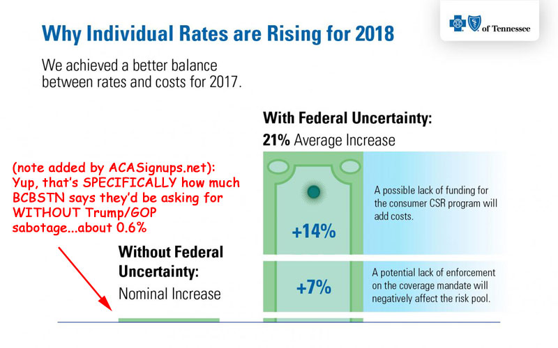 Yes, according to Blue Cross Blue Shield of Tennessee themselves, the one-two GOP sabotage threats to CSR funding and individual mandate enforcement are directly responsible for a jaw-dropping 97% of their requested premium increases for 2018 on the individual market.