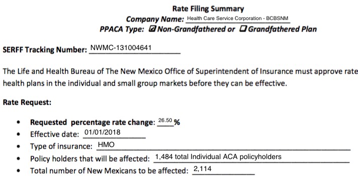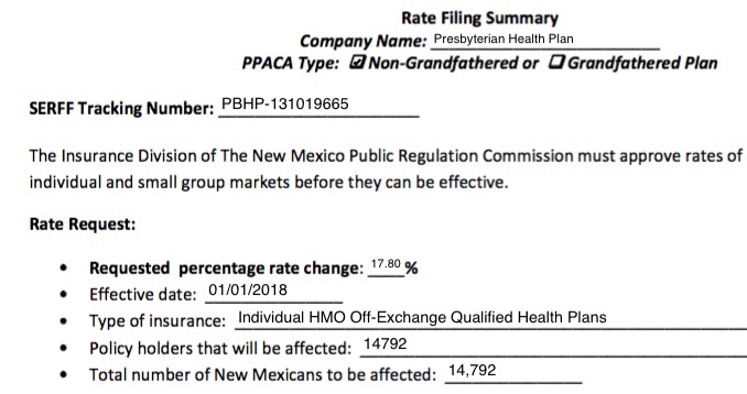 New Mexico's Insurance Superintendent has released their 2018 rate hike request filings.