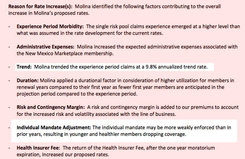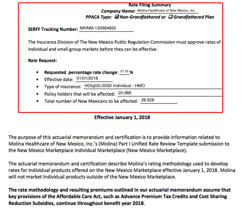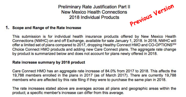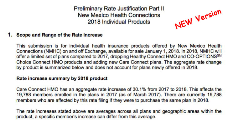 Finally, there's New Mexico Health Connection...which is, by the way, one of the few remaining ACA-created Co-Ops still around. NMHC's filing is confusing: The NM website database lists a jaw-dropping 84.9% average rate hike request...but when I went through the filings, I found a newer version which lists their increase request as "only" 30.1% on average. There's no specific reference to either CSRs or mandate enforcement in either of the filings that I could see, but there's this quote from a Politico article last month: