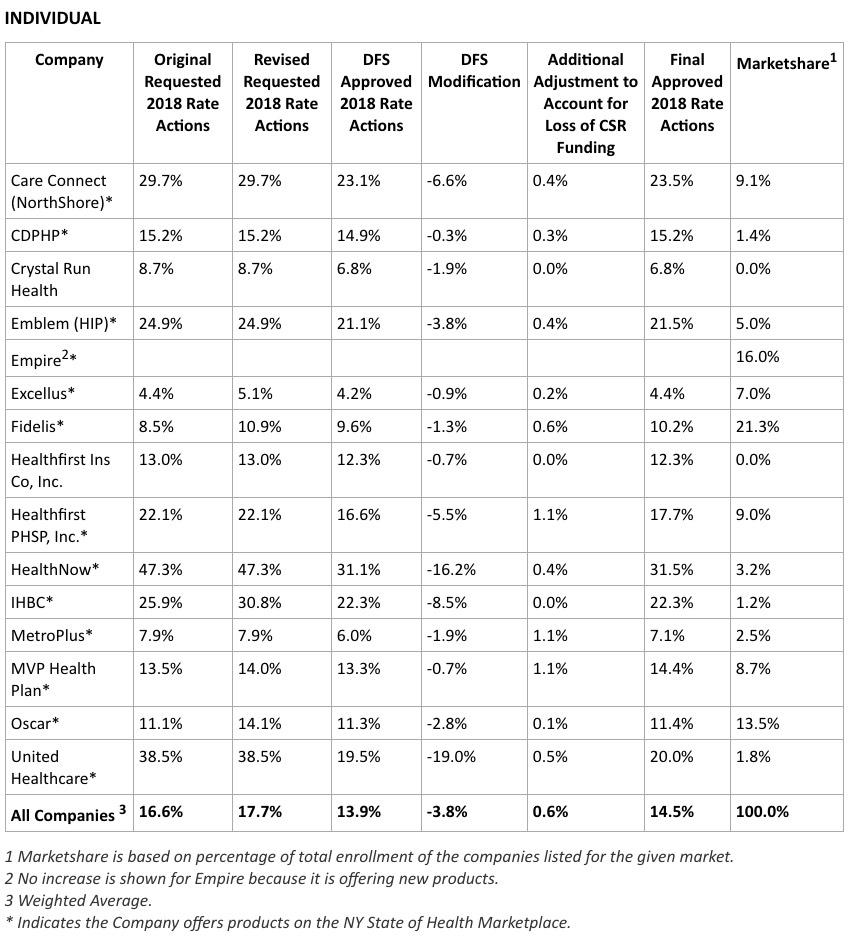 DFS ANNOUNCES 2018 HEALTH INSURANCE RATES IN A CONTINUED ROBUST NEW YORK MARKET