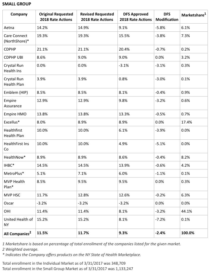 More than one million New Yorkers are enrolled in small group plans. Insurers requested an average rate increase of 11.7 percent in the small group market. DFS cut the requested rate increases by 2.4 percent to 9.3 percent for 2018, saving small businesses $166 million. A number of small businesses will also be eligible for tax credits that may lower those premium costs even further.