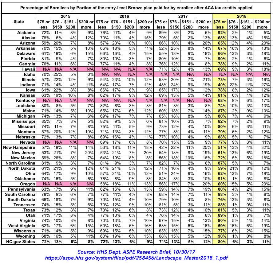Finally, they include a state-level breakout of what percent of enrollees will be eligible for a low-premium Bronze policy in 2018: