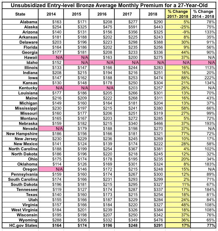...and here's the average unsubsidized entry-level Bronze plan for a 27-year old for each year: