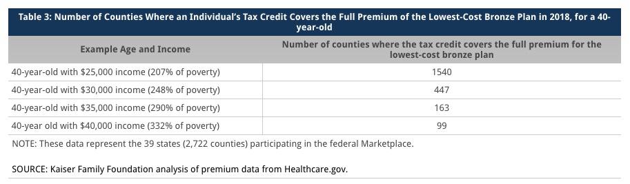 UPDATE: Here's another eye-opener: According to a Kaiser Family Foundation analysis of HHS data, a single 40-year old earning $25,000 can get a Bronze plan for free in over half the counties in the country: