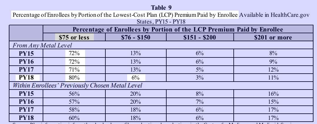 Next we come to the headline above: Donald Trump's HHS Department is officially informing the country that 80% of HealthCare.Gov exchange enrollees will be able to get an ACA policy for less than $75/month next year, and is even comparing it to prior years to show how this percentage is higher than ever. In addition, another 6% can get a Bronze plan for less than $150/month.